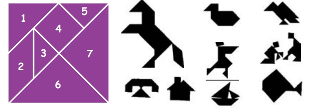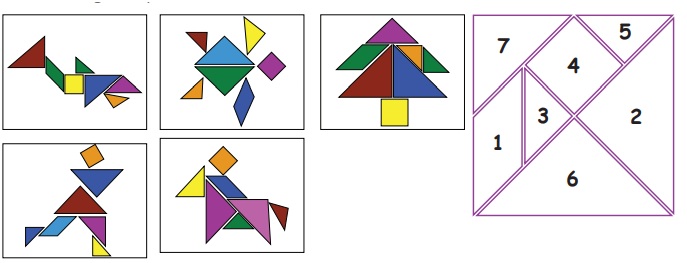 ஆசிரியர் குறிப்பு: டேன்கிராம் துண்டுகளைக் கொண்டு பல்வேறு வடிவங்களை உருவாக்க ஆசிரியர் மாணவர்களுக்கு உதவுலாம்.