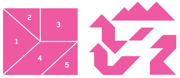 டேன்கிராம் புதிரின் எளிய வடிவம் 5 துண்டுகளை கொண்டு விளையாடப்படுகிறது.