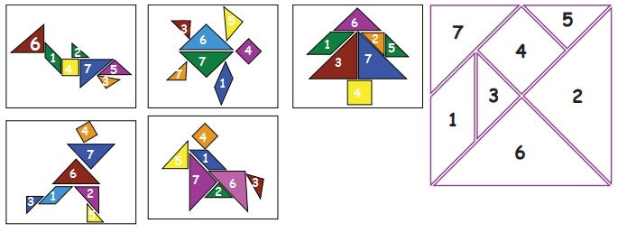 "டேன்கிராம்” புதிரில் உள்ள எண்களைப் பொறுத்து, கீழே கொடுக்கப்பட்ட ஒவ்வொரு படத்தில் உள்ள ஒவ்வொரு வடிவத்திற்கும் அதற்குறிய எண்ணை எழுதவும்.
