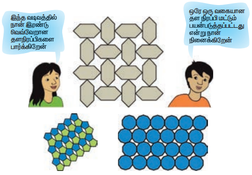 ஒரு சம தளத்தில், சதுரம் மற்றும் ஐங்கோணத்தை பயன்படுத்தி தளநிரப்பியை வரைய குழந்தைகளிடம் கூற வேண்டும்.