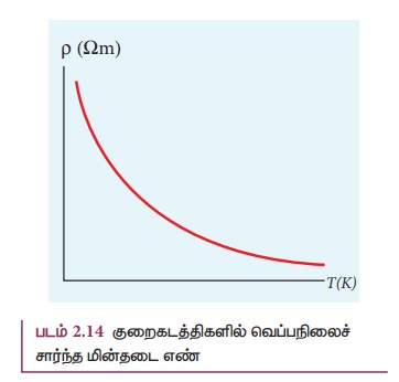இதனால் மின்னோட்டமும் அதிகரிக்கும். அதனால் மின்தடை எண் படம் 2.14 ல் காட்டியுள்ளவாறு குறையும். எதிர்க்குறி வெப்பநிலை மின்தடை எண் உடைய குறைக்கடத்தியானது வெப்ப தடையகம் (Thermistor) எனப்படும்.
