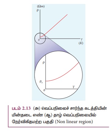 கடத்திகளுக்கு a நேர்க்குறியுடையது. கடத்திகளின் வெப்பநிலை அதிகரிக்கும்போது, கடத்தியில் உள்ள எலக்ட்ரான்களின் சராசரி இயக்க ஆற்றல் அதிகரிக்கும். இதன் விளைவாக மோதல்களின் எண்ணிக்கை அதிகரித்து மின்தடை எண்ணும் அதிகரிக்கும். சமன்பாடு (2.27) க்கான வரைபடம் படம் 2.13 ல் காட்டப்பட்டுள்ளது.