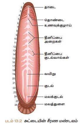 தீனிப்பை ஆகும். இது தொடர்ச்சியாக அமைந்த 10 அறைகளைக் கொண்டது. இவ்வறைகள் வட்டத் துளைகள்