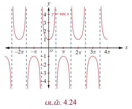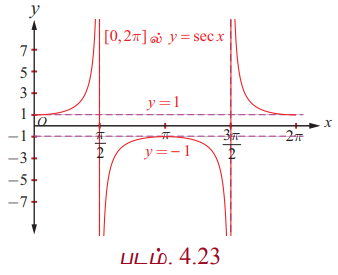 0 ≤ x ≤ 2π , x ≠ π/2 , 3π/2 −ல் சீகண்ட் சார்பின் வளைவரை படம் 4.23−ல் காண்பிக்கப்பட்டுள்ளது. முதல் மற்றும் நான்காம் காற்பகுதிகளில் அதாவது −π/2 < x < π/2 இடைவெளியில், y = sec x மிகையெண் மதிப்புகளை மட்டுமே பெறுகிறது. அதே சமயம் இரண்டாவது மற்றும் மூன்றாவது காற்பகுதிகளில் அதாவது π/2 < x < 3π/2 இடைவெளியில் குறையெண் மதிப்புகளையே பெறுகிறது.