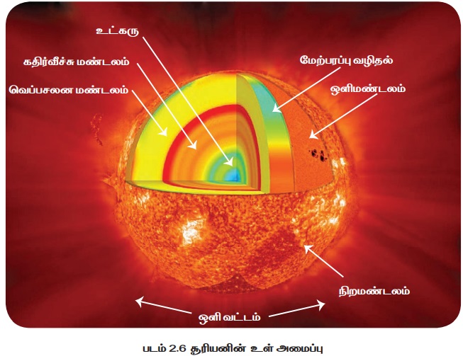 சூரியனில் 70.6% ஹைட்ரஜன், 27.4% ஹீலியம் மற்றும் 2% இதரவாயுக்களால் ஆனது. சூரியன் ஈர்ப்பு விசையால் மிக அதிகளவு பருப்பொருட்களை ஒன்றிணைத்து அளவற்ற அழுத்தத்தையும், வெப்பநிலையையும் அதன் மையப் பகுதியில் உருவாக்குகிறது. சூரியனின் உட்புறத்தில் மூன்று முதன்மையான அடுக்குகள் உள்ளன. அவை உட்கரு (Core), கதிர்வீச்சு மண்டலம் (Radiative Zone) மற்றும் வெப்ப உமிழ்வு சுழற்சி மண்டலம் (Convective Zone) ஆகும் (படம் 2.6). சூரியனின் மைய பகுதியில் காணப்படும் உட்கரு மிக வெப்பமான பகுதி ஆகும். இங்கு நடைபெறும் அணுக்கரு இணைவு வேதிவினை சூரியனுக்கு அதிக ஆற்றலை கொடுக்கிறது. இதற்கு அடுத்து வெளிப்புறத்தை நோக்கி அமைந்த அடுக்கை கதிர்வீச்சு மண்டலம் என்கிறோம். இந்த அடுக்கு முழுவதும் ஆற்றலானது போட்டான்கள் (photons) மூலம் வெப்பக் கதிர்களை எடுத்துச் செல்வதால் இந்த அடுக்கை கதிர்வீச்சு மண்டலம் என்கிறோம். சூரியனில் காணப்படும் மூன்றாவது மற்றும் கடைசி அடுக்கை வெப்ப உமிழ்வு சுழற்சி மண்டலம் என்கிறோம். இந்த அடுக்கில் வெப்ப ஆற்றல் சுழற்சி வழியாக ஆதிக்கம் செலுத்துவதால் இதனை வெப்ப உமிழ்வு சுழற்சி மண்டலம் என்கிறோம். சூரியனின் உட்பகுதிக்கும் சூரிய வளிமண்டலத்திற்கும் இடைப்பட்ட எல்லைப்பகுதியை ஒளி மண்டலம் (Photosphere) என அழைக்கிறோம். இதை தான் நாம் சூரியனின் 'மேற்பரப்பு' ஆக காண்கிறோம்.
