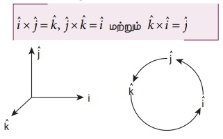 (vii) வலதுகை திருகு விதியின்படி, செங்குத்து ஓரலகு வெக்டர்களின் வெக்டர் பெருக்கல் கீழ்க்கண்டவாறு காணப்படும்.