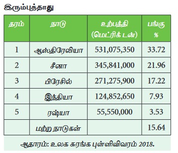 ஆகும். சீனா, பிரேசில், இந்தியா மற்றும் ரஷ்யா போன்றவை இரும்புத்தாது உற்பத்தியில்