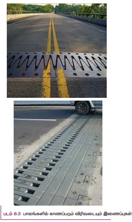 பொருள்களின் மூன்று நிலைகளும் (திட, திரவ மற்றும் வாயு) வெப்பப்படுத்தும் போது விரிவடையும். திடப்பொருளொன்றை வெப்பப்படுத்தும்போது அதன் அணுக்கள் அவற்றின் சமநிலைப் புள்ளியைப் பொருத்து வேகமாக அதிர்வடைகின்றன. மற்ற பொருள்களுடன் ஒப்பிடும் போது திடப்பொருள்களின் அளவில் ஏற்படும் மாற்றம் குறைவானதாகும். இரயில் வண்டிகளின் இருப்புப்பாதைகளில் சில இடங்களில் சிறிய இடைவெளி விடப்பட்டிருக்கும். ஏனெனில் கோடை காலங்களில் இருப்புப்பாதை விரிவடையும். அவ்வாறு வெப்பநிலை மாற்றங்களின் போது எளிதாக விரிவடையவும், சுருங்கவும் ஏற்ற வகையில் பாலங்களிலும், இருப்புப்பாதைகளிலும் விரிவடையும் இணைப்புகள் படம் (8.3) இல் உள்ளவாறு காணப்படும்.