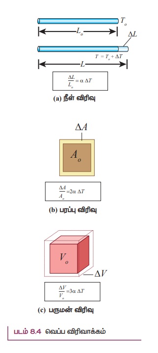 நீளத்தில் ஏற்படும் விரிவு நீள் விரிவு (linear expansion) என அழைக்கப்படும். இதேபோன்று பரப்பில் ஏற்படும் விரிவு பரப்பு விரிவு (Area expansion) எனவும், பருமனில் ஏற்படும் விரிவு பரும் விரிவு (Volume expansion) எனவும் அழைக்கப்படும். படம் 8.4 ல் இவ்விரிவுகள் காட்டப்பட்டுள்ளது.