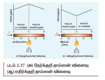 C எனும் மையப்புள்ளியில் வெப்பப்படுத்தப்படும் AB எனும் தாமிரத் தண்டு வழியே மின்னோட்டம் பாய்கிறது எனில், C என்ற புள்ளி உயர் மின்னழுத்தத்தில் அமையும். இதனால் AC பகுதியில் வெப்பம் உட்கவர்தலும் CB பகுதியில் வெப்பம் வெளிப்படுதலும் நடைபெறும். இது படம் 2.37 (அ) வில் காட்டப்பட்டுள்ளது.