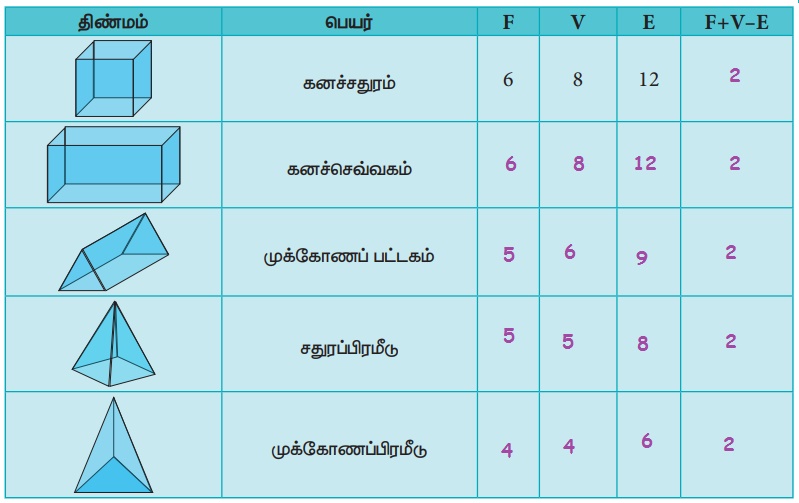 பின்வரும் பன்முக வடிவங்களின் முகங்கள், உச்சிகள் மற்றும் விளிம்புகளின் எண்ணிக்கையை அட்டவணைப்படுத்துக. மேலும் F + V – E ஐக் கண்டுபிடி.