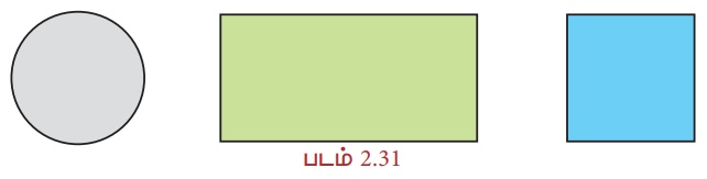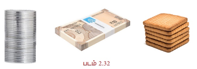 நீங்கள் வரைந்த வடிவங்கள் யாவை? வட்டம், செவ்வகம் மற்றும் சதுரம். இந்த வடிவங்கள் தள உருவங்களைக் குறிக்கின்றன. மேலும், இத்தள உருவங்களுக்கு நீளம் மற்றும் அகலம் ஆகிய இரண்டு பரிமாணங்கள் உள்ளன. இப்பொழுது, நீங்கள் வரைந்த உருவங்களின் மீது முறையே சில இரண்டு ரூபாய் நாணயங்கள், பத்து ரூபாய் நோட்டுகள் மற்றும் சதுர வடிவ பிஸ்கட்டுகள் ஆகியவற்றைப் படம் 2.32 இல் காட்டியுள்ளவாறு ஒன்றன் மீது ஒன்றாக வைக்கவும்.
