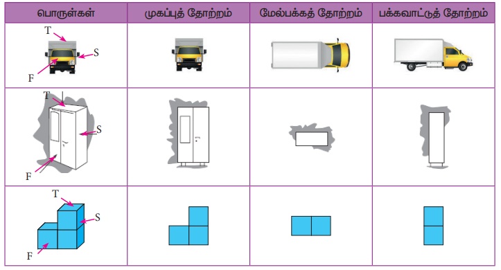 ஒரு 3−D வடிவமானது வெவ்வேறு நிலைகளிலிருந்து காணும் போது, மாறுபட்டத் தோற்றமளிக்கிறது. அவ்வாறு 3−D வடிவத்தை உற்றுநோக்கும் பொழுது, நமது பார்வைக்குத் தெரிவதே 3−D வடிவத்தின் தோற்றம் ஆகும். முகப்புத்தோற்றம், மேல்பக்கத்தோற்றம் மற்றும் பக்கவாட்டுத்தோற்றம் ஆகியவை சில வகையான தோற்றங்கள் ஆகும். சில பொருட்களின் வெவ்வேறான தோற்றங்கள் கீழே காட்டப்பட்டுள்ளன.