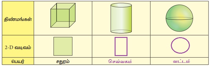பின்வரும் திண்ம வடிவங்களின் குறுக்கு வெட்டுத்தோற்றத்திலிருந்து பெறப்படும் இருபரிமாண வடிவங்களை (2−D) வரைந்து, அவற்றின் பெயர்களை எழுதுக.