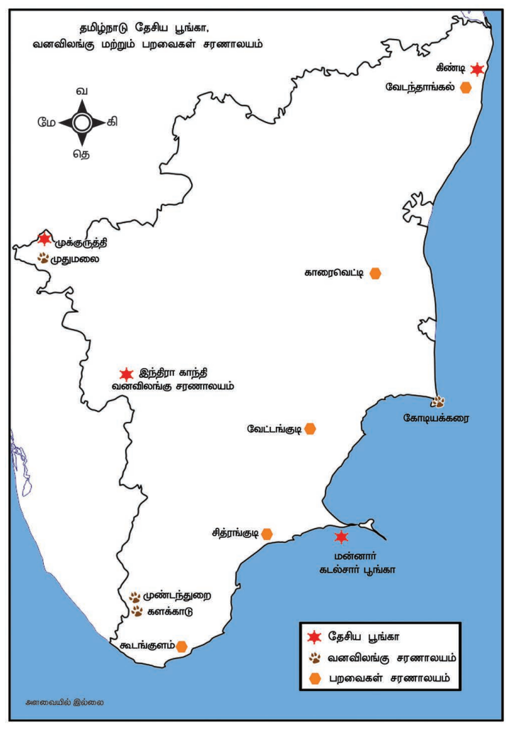 அ) வனவிலங்குகள், பறவைகள் சரணாலயம், வனவிலங்குப் பாதுகாப்புச் சரணாலயம், மிருகக்காட்சி சாலை.