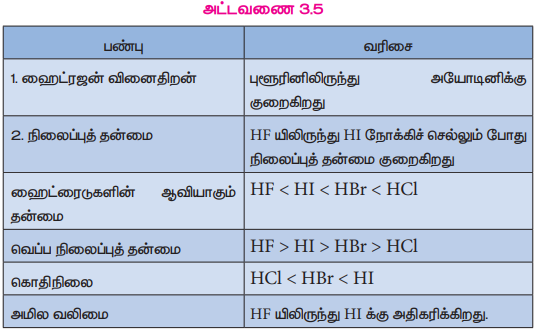 1. ஹைட்ரஜன் வினைதிறன் : புளூரினிலிருந்து அயோடினிக்கு குறைகிறது