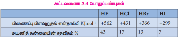 அமில வலிமை : HF யிலிருந்து HI க்கு அதிகரிக்கிறது.