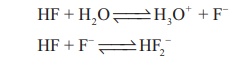 அதிகச் செறிவில், சமநிலையில் புளூரைடு அயனிகள் நீக்கப்படுதல் முக்கியத்துவம் பெறுகிறது. ஏனெனில் இது ஹைட்ரஜன் புளூரைடின் பிரிகையுறுதலை பாதிக்கிறது. மேலும் ஹைட்ரஜன் அயனியின் செறிவை அதிகரிக்கிறது. NaHF2, KHF2 மற்றும் NH4HF2 போன்ற பல நிலையான உப்புகள் அறியப்படுகின்றன. பிற ஹைட்ரஜன் ஹேலைடுகள் ஹைட்ரஜன் டைஹேலைடுகளை உருவாக்குவதில்லை.