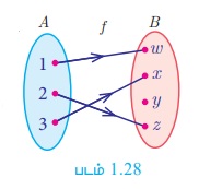 இங்கு, f-ன் வீச்சகம் f = {w, x, z} ⊂ B (படம்.1.28) என்பதால், f ஆனது உட்சார்பு ஆகும். y ∈ B -க்கு முன் உரு A-ல் இல்லை என்பதை நோக்குக.
