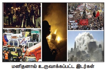 கலவரங்கள், தீவிரவாத செயல்கள் போன்றவை மனிதனால் உருவாக்கப்படும் இடர்களுக்கு சில உதாரணங்களாகும்.