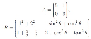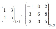 என்பன 2 × 2 மற்றும் 3 × 3 வரிசையுடைய சதுர அணிகள் ஆகும். A = (aij )m ×m என்பது m வரிசையுடைய ஒரு சதுர அணி ஆகும்.