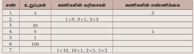 இரண்டாவது நிரலில் உள்ள உறுப்புகளின் எண்ணிக்கைக்கும் நான்காவது நிரலில் உள்ள அணிகளின் எண்ணிக்கைக்கும் உள்ள தொடர்பைக் காணமுடிகிறதா? ஆம் எனில், விடுபட்ட கட்டங்களை நிரப்புக.