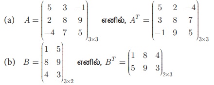 அணி A - யின் வரிசை m × n எனில், AT - யின் வரிசை n × m ஆகும்.