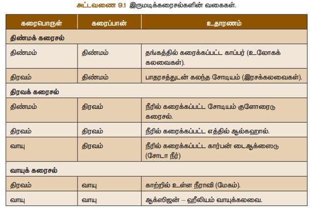 முக்கிய காரணியாக விளங்குகிறது. பல்வேறு வகையான இருமடிக்கரைசல்களை அட்டவணை 9.1-இல் காணலாம்.
