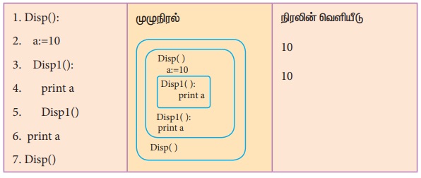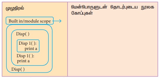 Disp ( ) என்ற செயற்கூறினுள் வரையறுக்கப்பட்டுள்ளது. 'a' என்ற மாறி Disp ( ) என்ற செயற்கூறினுள்