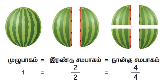 அனைவருக்கும் தாகம் எடுக்க அருகில் உள்ள பழக்கடையில் ஒரு தர்பூசணி வாங்கினர். அதை நான்கு சமபாகமாக வெட்டி ஆளுக்கு ஒரு பாகமாக உண்டனர். அவர்கள் பங்கு பிரித்த முறையை காண்போமா?