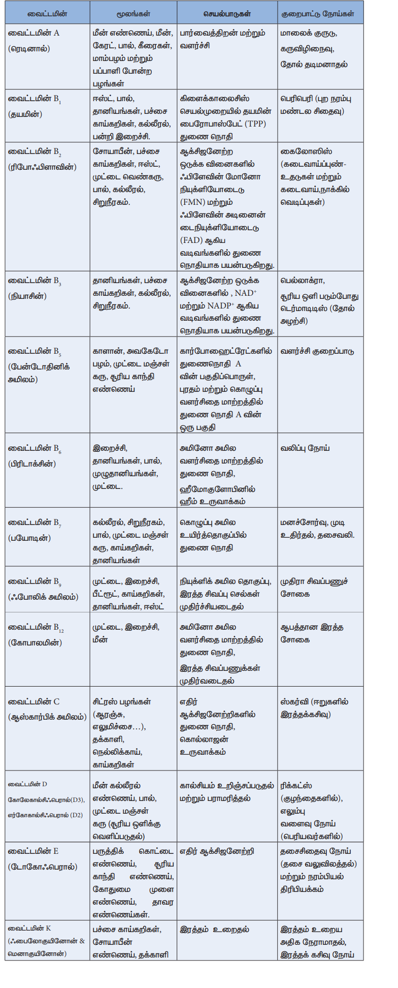 வைட்டமின்கள் என்பவை நமது உடலால் தொகுக்க இயலாத, ஆனால் சில குறிப்பிட்ட செயல்பாடுகளுக்கு அத்தியாவசியமான சிறிய கரிம சேர்மங்களாகும். எனவே, இவை உணவின் மூலமாக உட்கொள்ளப்படவேண்டும். இவற்றின் தேவை மிகக் குறைவே எனினும், இவற்றின் பற்றாக்குறை அல்லது மிகுதியளவானது நோய்களை உண்டாக்குகின்றன. கார்போஹைட்ரேட்கள் மற்றும் லிப்பிடுகள் போன்று இவை ஆற்றல் மூலங்களாக செயல்படுவதில்லை. உயிர் அமைப்புகளில் ஒவ்வொரு வைட்டமினும் ஒரு குறிப்பிட்ட செயலைச் செய்கின்றன, பெரும்பாலும் அவை துணை நொதிகளாக செயல்படுகின்றன.
