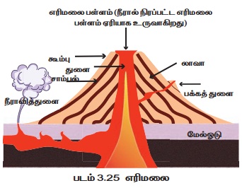 புவியின் மேற்பரப்பில் உள்ள பிளவு அல்லது துளை வழியே மாக்மா, வாயுக்கள், மற்றும் சாம்பல்கள் ஆகியவை வெளியேறுவது எரிமலை என்கிறோம். புவியின் ஆழ் பகுதியில் உள்ள பாறைக்குழம்பு 'மாக்மா' எனப்படும். இந்த பாறைக்குழம்பு புவி மேற்பரப்பிற்கு வரும் பொழுது 'லாவா' எனப்படுகிறது. (படம் 3.25)