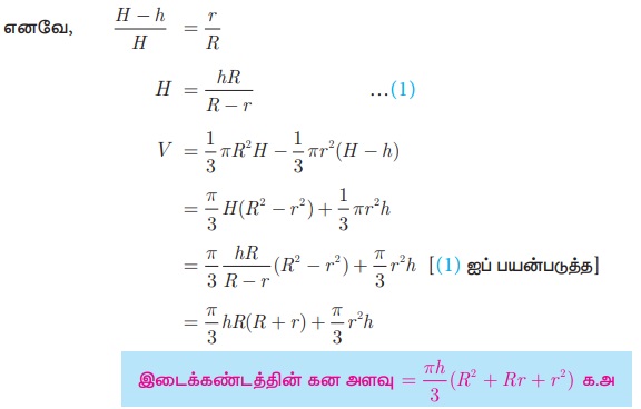 வரையறை, சூத்திரம், தீர்க்கப்பட்ட எடுத்துக்காட்டு கணக்குகள் | அளவியல் | கணக்கு - கூம்பினுடைய இடைக்கண்டத்தின் கன அளவு | 10th Mathematics : UNIT 7 : Mensuration