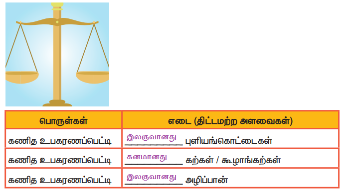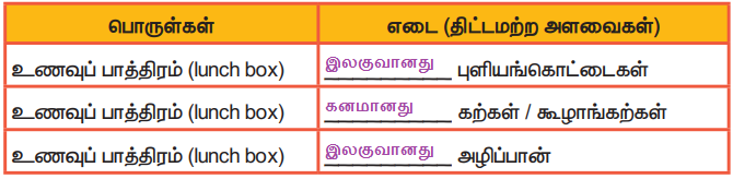 எளிய தராசின் ஒரு தட்டில் உங்கள் கணித உபகரணப் பெட்டியை வைத்தும் மற்றொரு தட்டில் பின்வரும் பொருள்களை வைத்தும் அதன் எடையைக் கணக்கிடவும். 1) புளியங்கொட்டைகள் 2) கற்கள் / கூழாங்கற்கள் மற்றும் 3) அழிப்பான், நீங்கள் கண்டறிந்த எடையை அட்டவணை படுத்தவும்.
