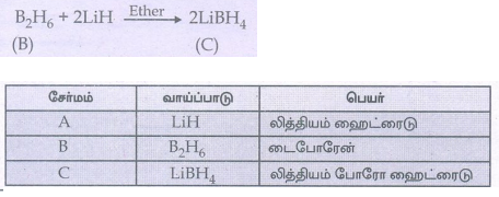 எனவே சேர்மம் (B) ஆனது டைபோரேன் மற்றும் சேர்மம் (C) ஆனது லித்தியம் போரோ ஹைட்ரைடு ஆகும்.